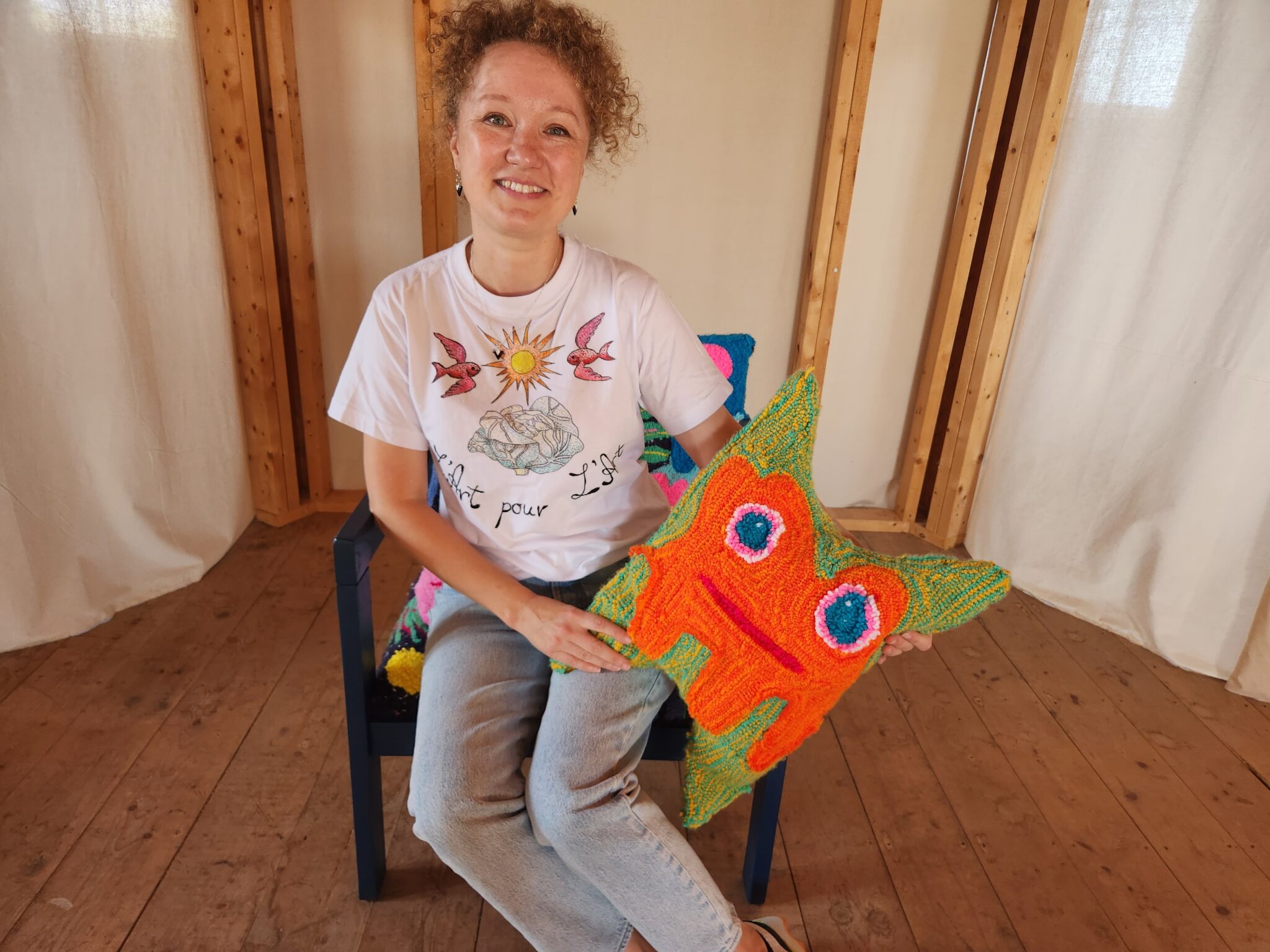 C’est pourquoi elle aime que les visiteurs s’amusent avec ses œuvres, enfilent la couronne, s’assoient dans le fauteuil, s’enroulent dans son gentil monstre marin.
