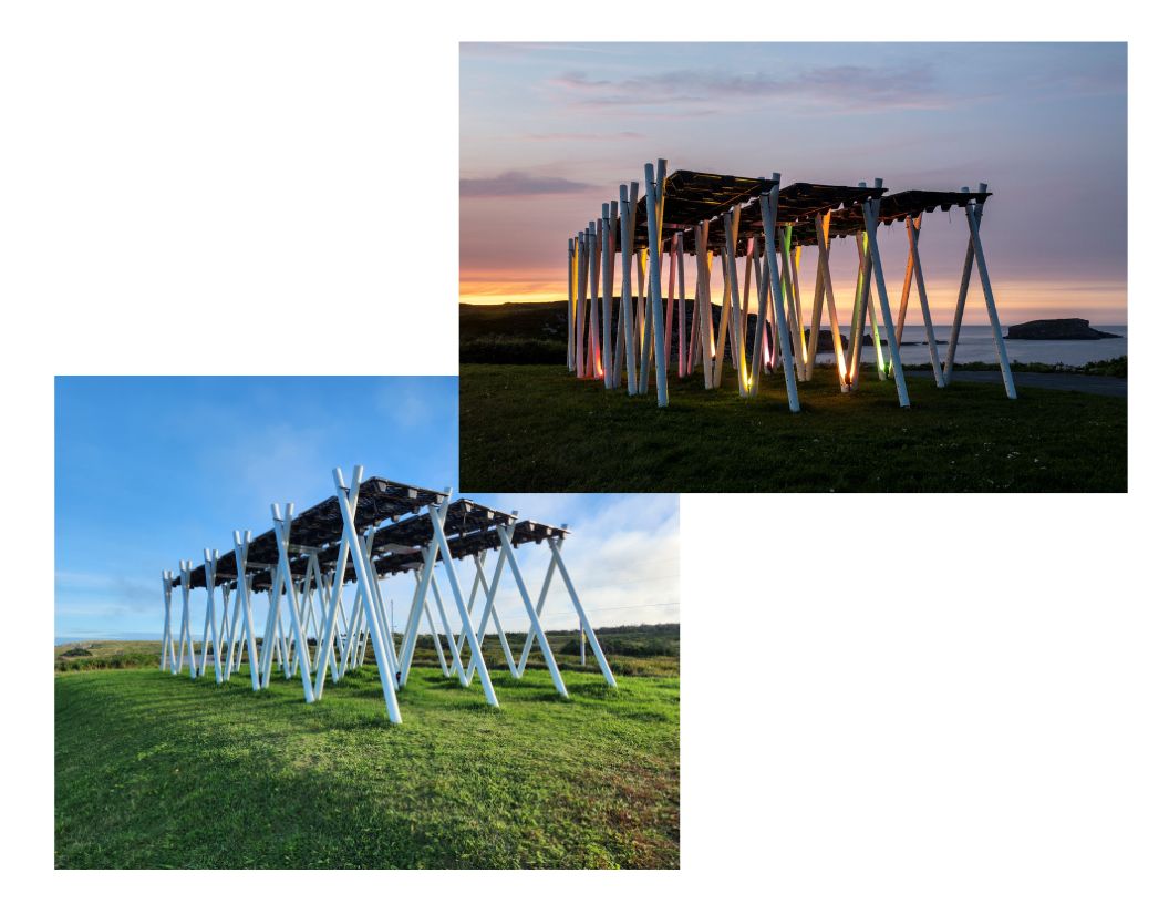 L’œuvre de l’artiste Jake Chakasim, de la nation Crie d’Ontario, évocation d’un chafaud pour sécher la morue, beau de jour, spectaculaire de nuit!