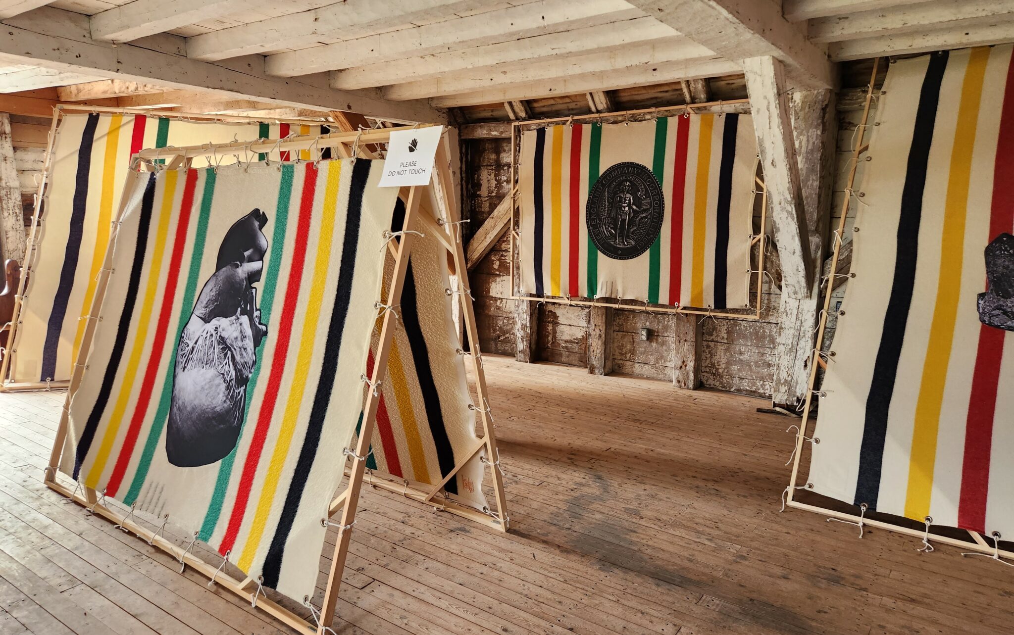 L’installation de Shelley Niro, artiste Mohawk, qui se sert des couvertures traditionnelles de la Compagnie de la Baie d’Hudson, symbole de la traite des fourrures, pour exprimer la relation difficile entre colonisateurs et autochtones.