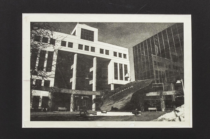 Un panorama de la ville de Saint-Pierre, pris du tournant de l’Anse à Pierre… où l’on peut observer les quartiers qui s’étalent autour … de la tour Aliant haute d’une centaine de mètres. Sur une autre carte postale l’ancienne gare de Moncton remplace la préfecture de Saint-Pierre et Miquelon.