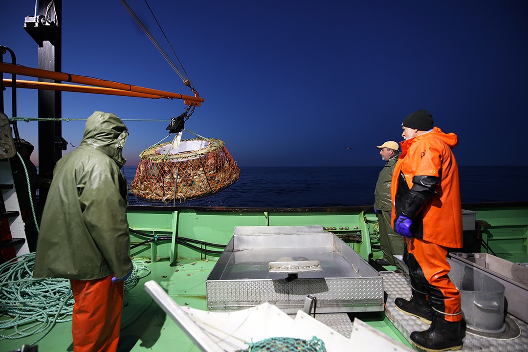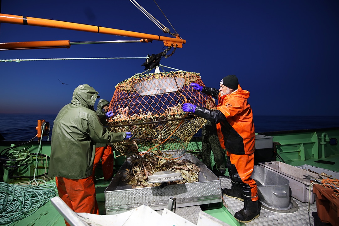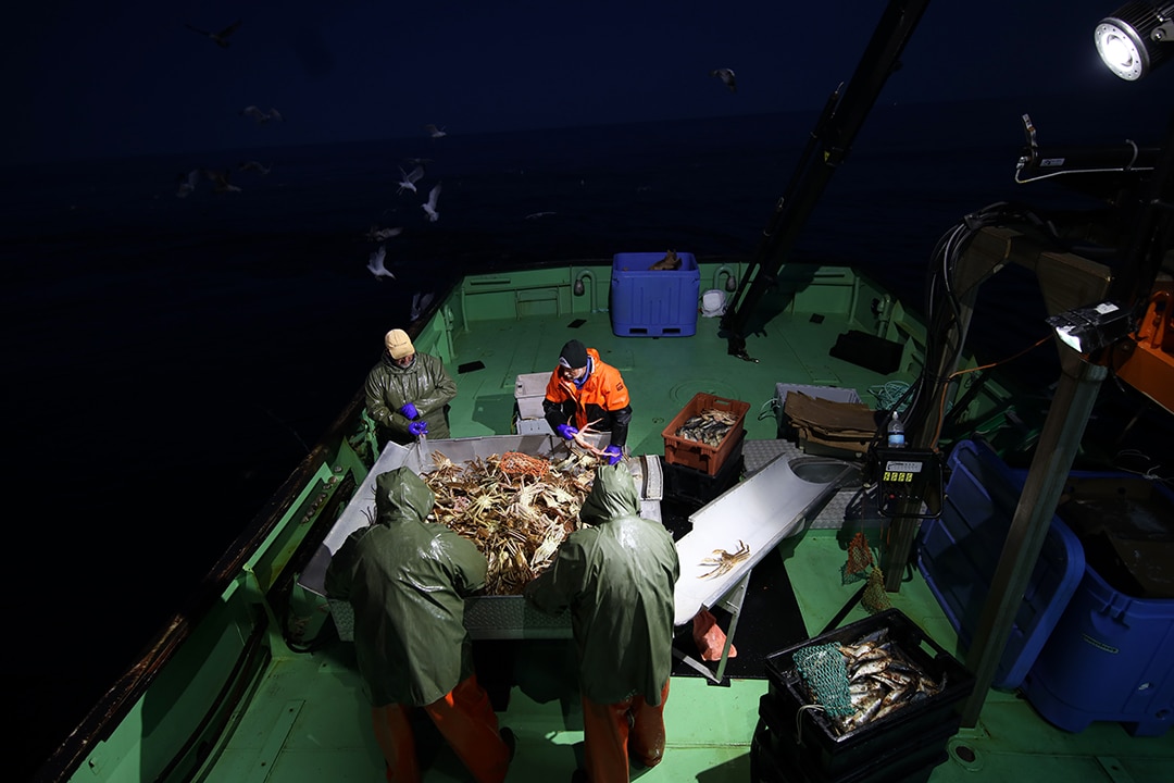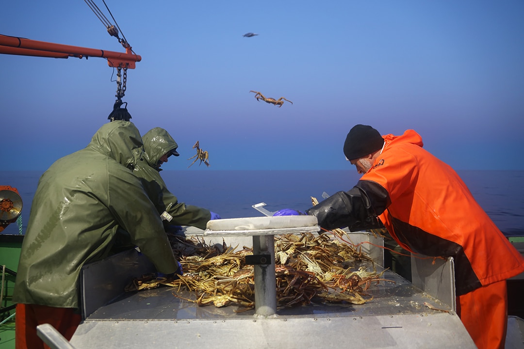Les quatre membres d’équipage, Carlo, André, Denis et Réjean, pêchent ensemble depuis plus de vingt ans sur le Carlo G. Certains depuis plus longtemps encore. Le rituel est bien assimilé, tout se déroule rondement. Les casiers sont tirés à bord avec un treuil qui les place au-dessus d’une table amovible. Elle se soulève pour la répartition des crabes, ceux de bonne dimension sont envoyés dans la cale et les petits sont rejetés à la mer. Les crabes femelles étant trop petits, seuls les crabes mâles sont commercialisés ce qui aide à préserver la ressource.