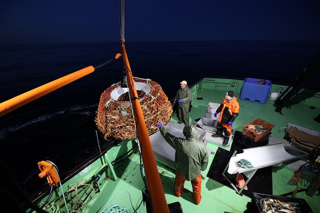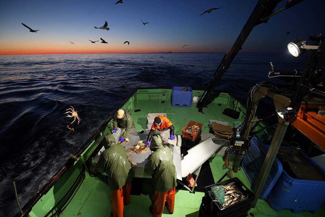 Cette seconde étape se déroule dans l’atmosphère particulière d’une fin de journée sur l’eau. Le crépuscule s’étire en teintes orangées qui se reflètent sur la mer tandis que les goélands, attirés par les phares du bateau, volent tout autour en lâchant quelques cris. C’est l’heure magique et je me sens particulièrement privilégiée d’être là, au milieu de la mer à perte de vue. La pêche se poursuit calmement, le même rituel s’enchaîne d’une levée de casier à une autre et pourtant, tout semble différent. Je continue à prendre des photos qui seront nimbées d’un certain mystère car la nuit sur l’eau porte à l’imaginaire.