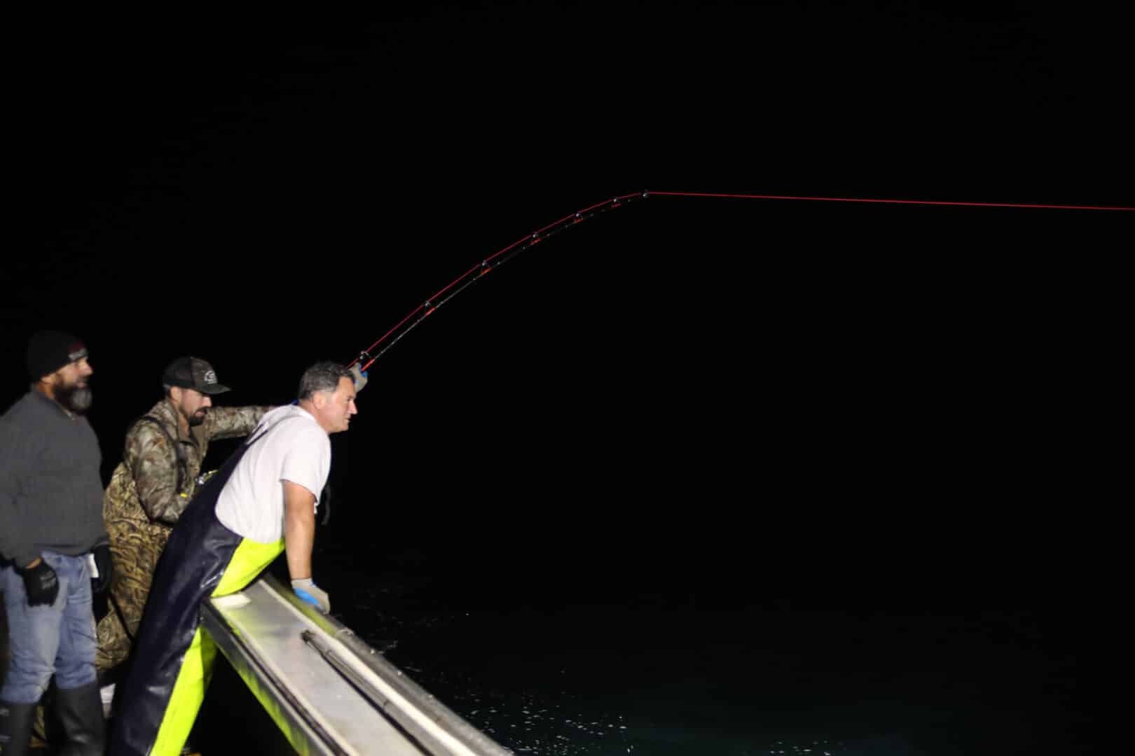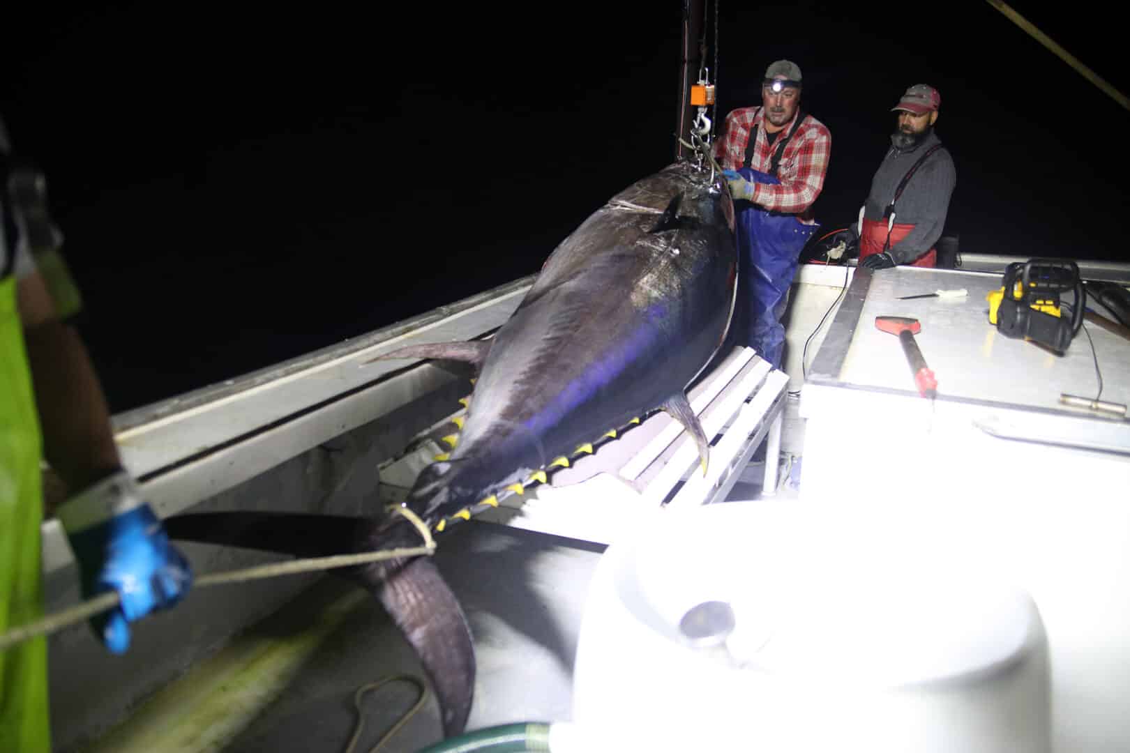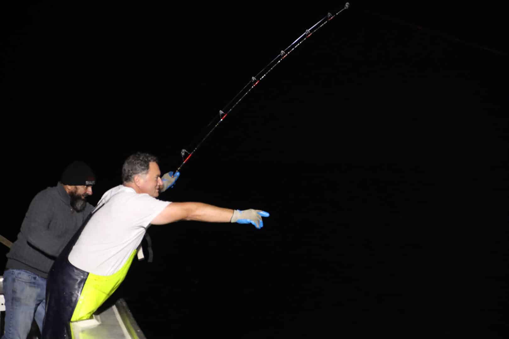 - Le fil rouge est bien tendu, le thon a mordu. Olivier est au moulinet tandis que Raymond et John scrute l’obscurité en espérant voir apparaître le thon. Crédit photo Julie D’Amour-Léger HDE