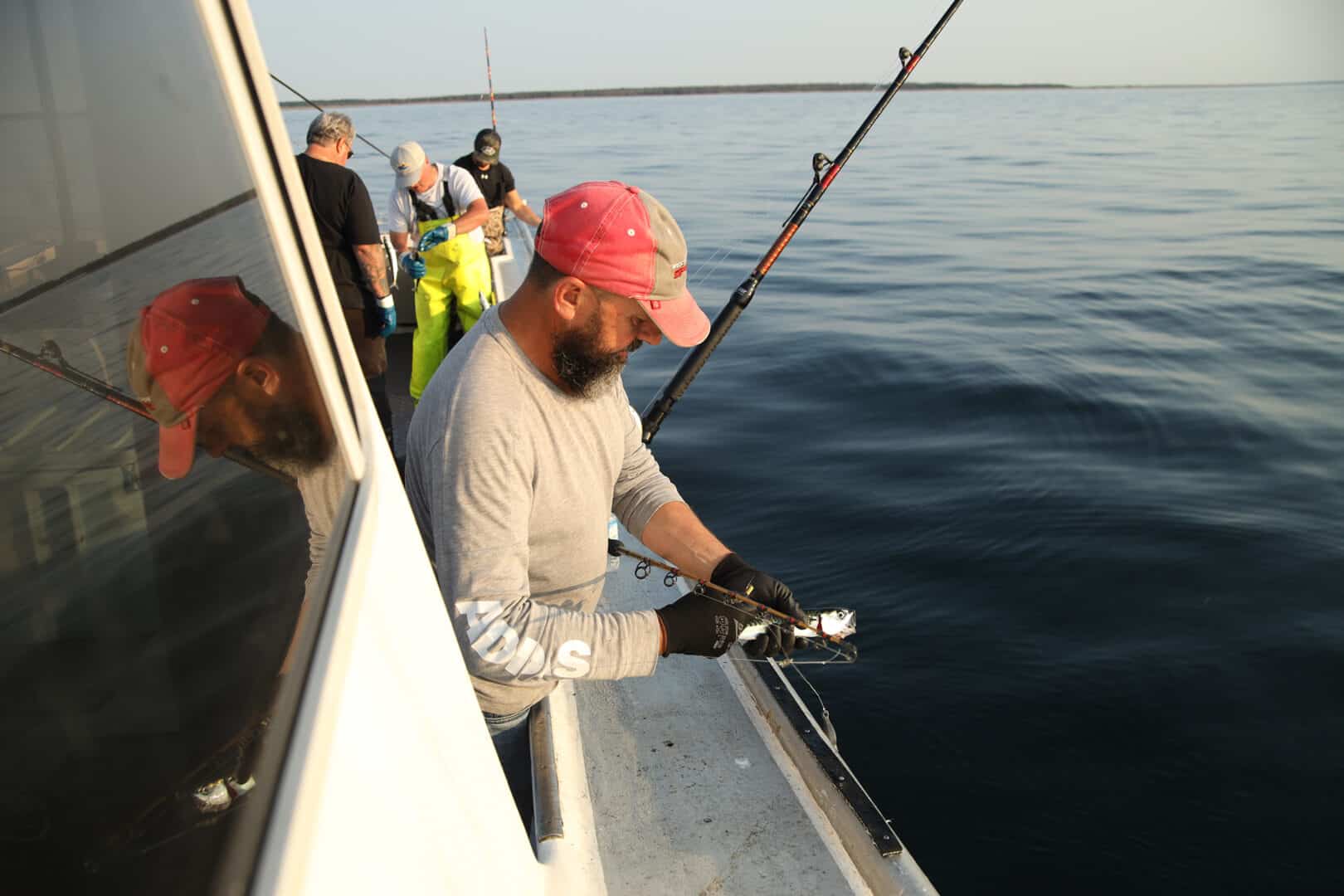 Chaque capture exige un permis et les pêcheurs offrent leurs services à son détenteur, Charles Roy dans ce cas-ci, qui doit être à bord selon le règlement. Nous accompagne aussi Olivier Gagnon, un vidéaste qui propose des capsules vidéo sur sa chaîne YouTube.