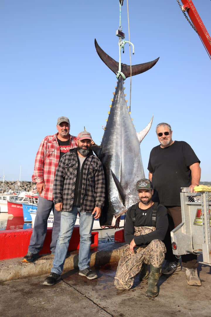 James, Raymond, Olivier et Charles posent fièrement avec le thon. John se repose avant le retour à Miscou. Crédit photo Julie D’Amour-Léger HDE