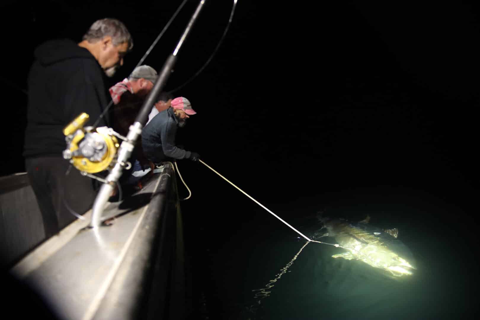 Sous le phare du bateau, la ligne d’un rouge éclatant est bien tendue. Les pêcheurs se remplacent au moulinet avec style et savoir-faire. Il faut tirer et freiner la ligne sans la relâcher car le poisson pourrait profiter du mou pour plonger et la casser, même si elle peut supporter 300 livres de pression.