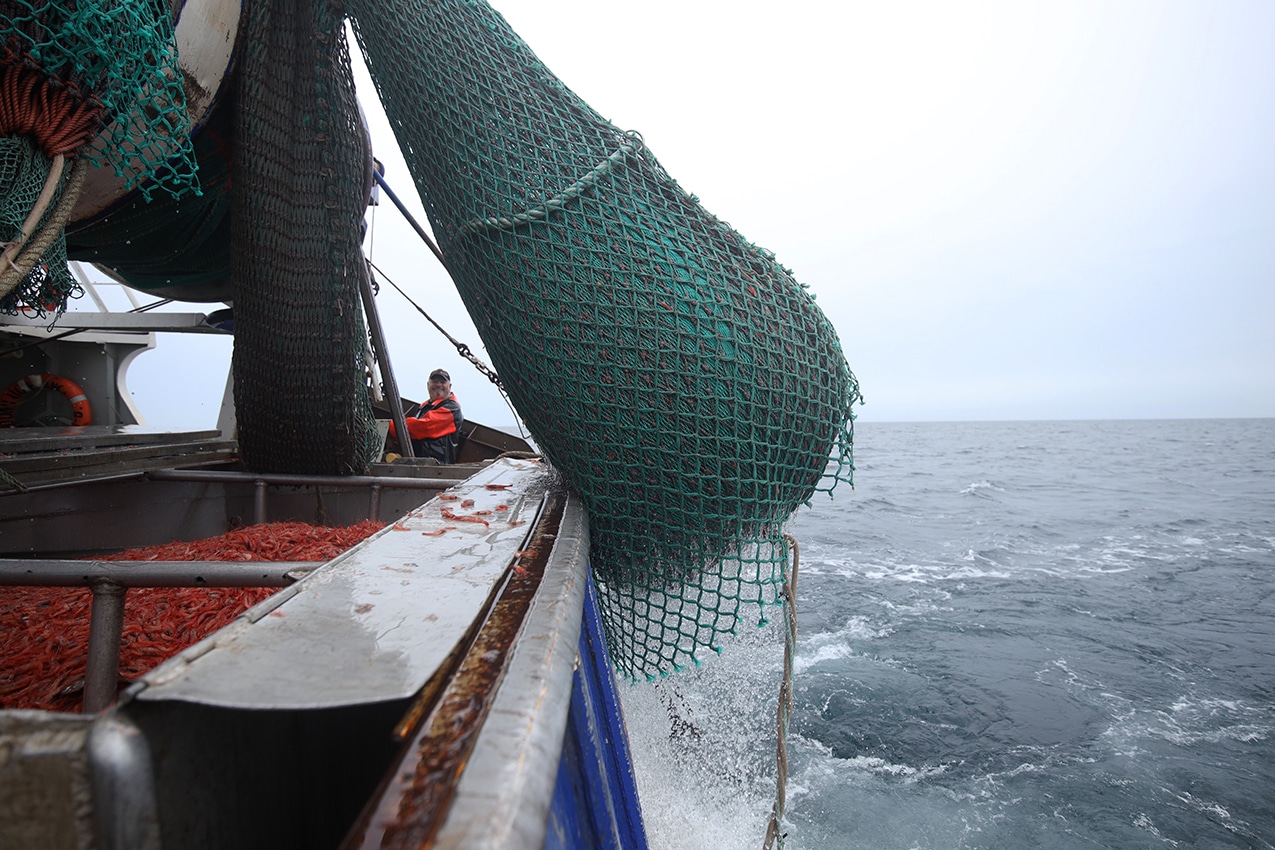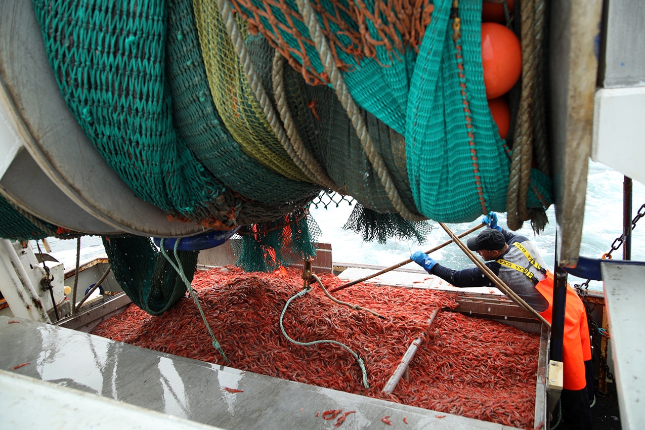 Je suis aux premières loges pour voir le chalut qui émerge et qui s’enroule, toujours dans un bruit d’enfer, jusqu’à son apogée, cette poche remplie à pleine capacité que l’on libère de son contenu rouge flamboyant avant de procéder à la levée du deuxième chalut, tout aussi généreux que le premier. C’est époustouflant! Au terme des cinq jours de pêche, après une vingtaine de levées, ce voyage aura récolté 50 000kg de crevettes!