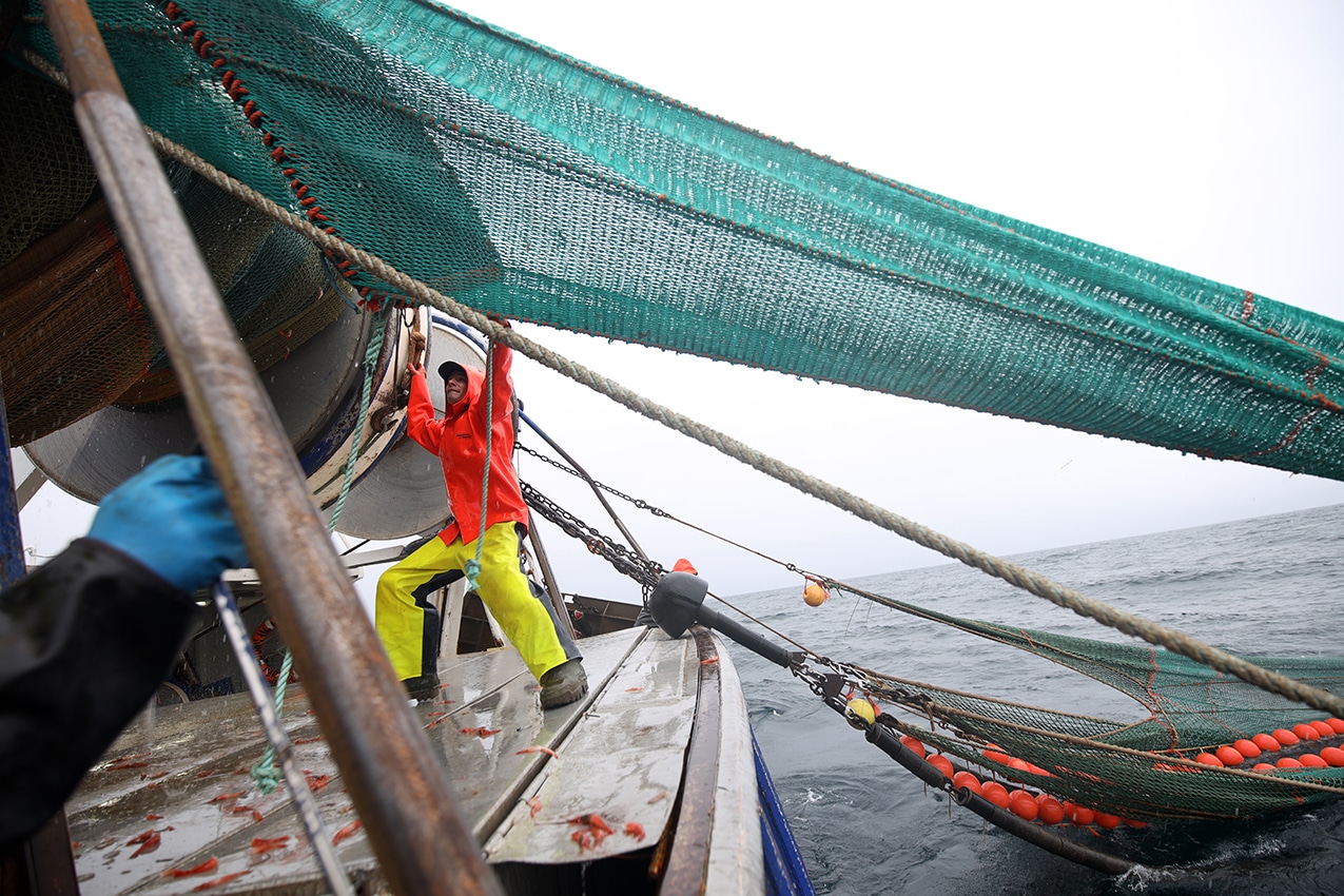 Vers 8 heures le lendemain matin, le rituel recommence. J’assiste cette fois à la levée des chaluts du pont inférieur, au seuil de la salle de tri. Jacques Gionet et Rémi LeBouthillier sont à leur poste de part et d’autre du bateau alors que Kevin Plourde ajuste les chaluts et procède à l’accrochage et au délestage de la poche, en parfait équilibre sur la rambarde arrière. Il m’impressionne vraiment!