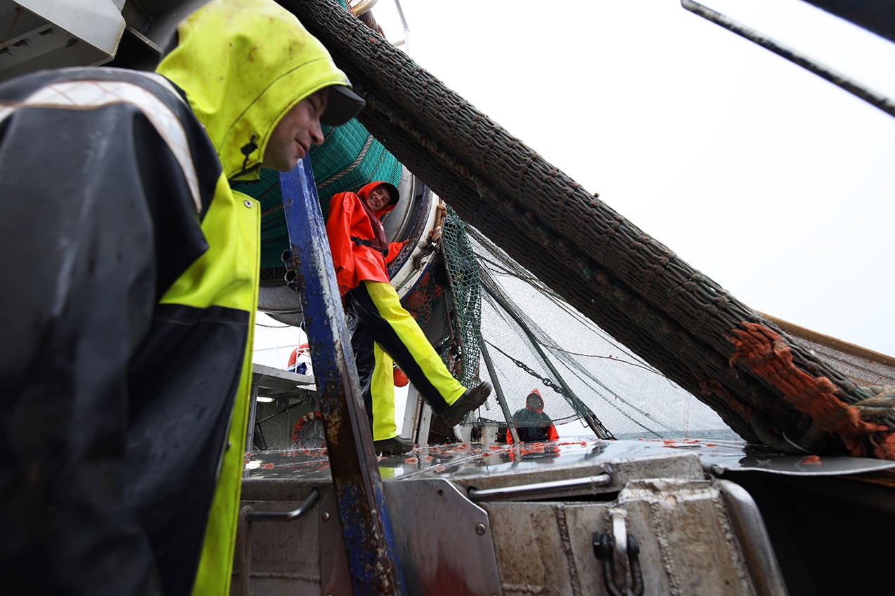 Le cul du premier chalut est hissé au-dessus du parc (un grand bac en acier) et son contenu est libéré en tirant sur le ruban de cul, le cordage qui ferme la poche. Une fois les deux poches vidées, on répartit les crevettes à l’aide de râteaux avant de soulever le bac qui se déverse dans un convoyeur vers le pont couvert, où s’effectue le tri et la mise en sac par coups de 11,4kg.