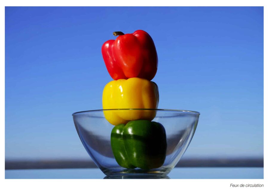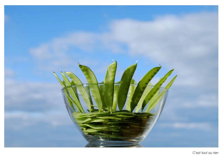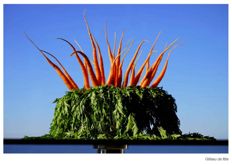 À travers la fenêtre, l’immensité du ciel qui s’étend au-dessus de la mer offre une toile de fond azur aux carottes et aux petits pois qui prennent la pose. À chacune des séances photo, j’ai mijoté une mise en scène faisant ressortir la « personnalité » des légumes, mettant en valeur leur caractéristique. Sous forme de jeux de mots ou de références, les titres viennent souligner avec humour l’idée qui a animé chacune de ces créations.
