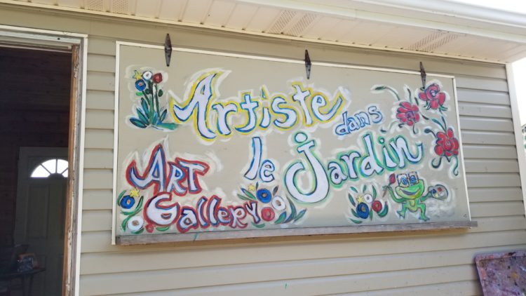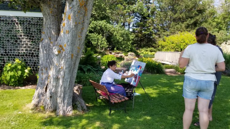 Lucie est là, justement, durant ma visite. Elle peint son Acadie, prend le temps d’expliquer son travail aux visiteurs, de savoir d’où ils viennent. Elle profite aussi, comme nous tous et toutes, de la beauté du lieu, du chant des oiseaux, de la fontaine et du bruit de l’océan tout proche.