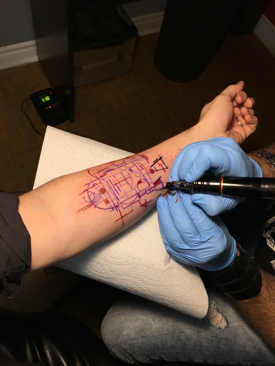 Je m’y rends un peu nerveux, car mon dernier tatouage remonte à 2002, plus de 16 ans passés. Vais-je avoir mal ? Est-ce que je fais un bon choix ? À mon arrivée, je rencontre Buzz Hébert, tatoueur depuis plus de 25 ans. On discute de mon choix de tatouage. Il prépare le matériel, je m’installe et je ressens l’aiguille percer ma peau. Ça ne fait pas si mal que ça. Le tatouage est terminé en deux heures trente minutes. Après une dizaine de jours, il est guéri et je me rends à l’évidence, j’en veux un autre! J’ai la piqûre!